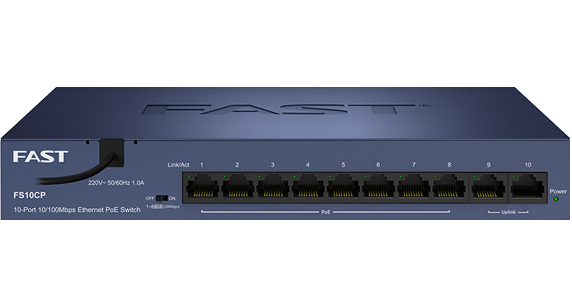 - 提供10个10/100M自适应RJ45端口,包括8个PoE端口和2个Uplink端口;